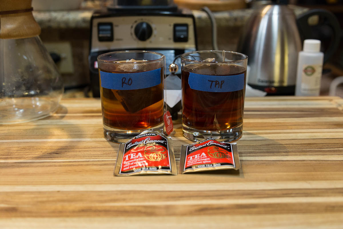 To demonstrate the effect of alkalinity (and plagiarize Malcolm) on tannin extraction, I made tea using two sources of water: My tap water with estimated 503 PPM Total Alkalinity (as CaCO3), and my brewery RO water. The results are very clear. The RO tea is extremely bright, clear, and has a medium golden/brown color, where the Tap tea is dark, murky mahogany and very cloudy. In tasting, the RO tea is milder but robust with a fully rounded tea flavor, and a low astringency. The Tap tea is harsh and extremely bitter and highly astringent. I stopped drinking homemade tea because of this problem, but now have a solution.