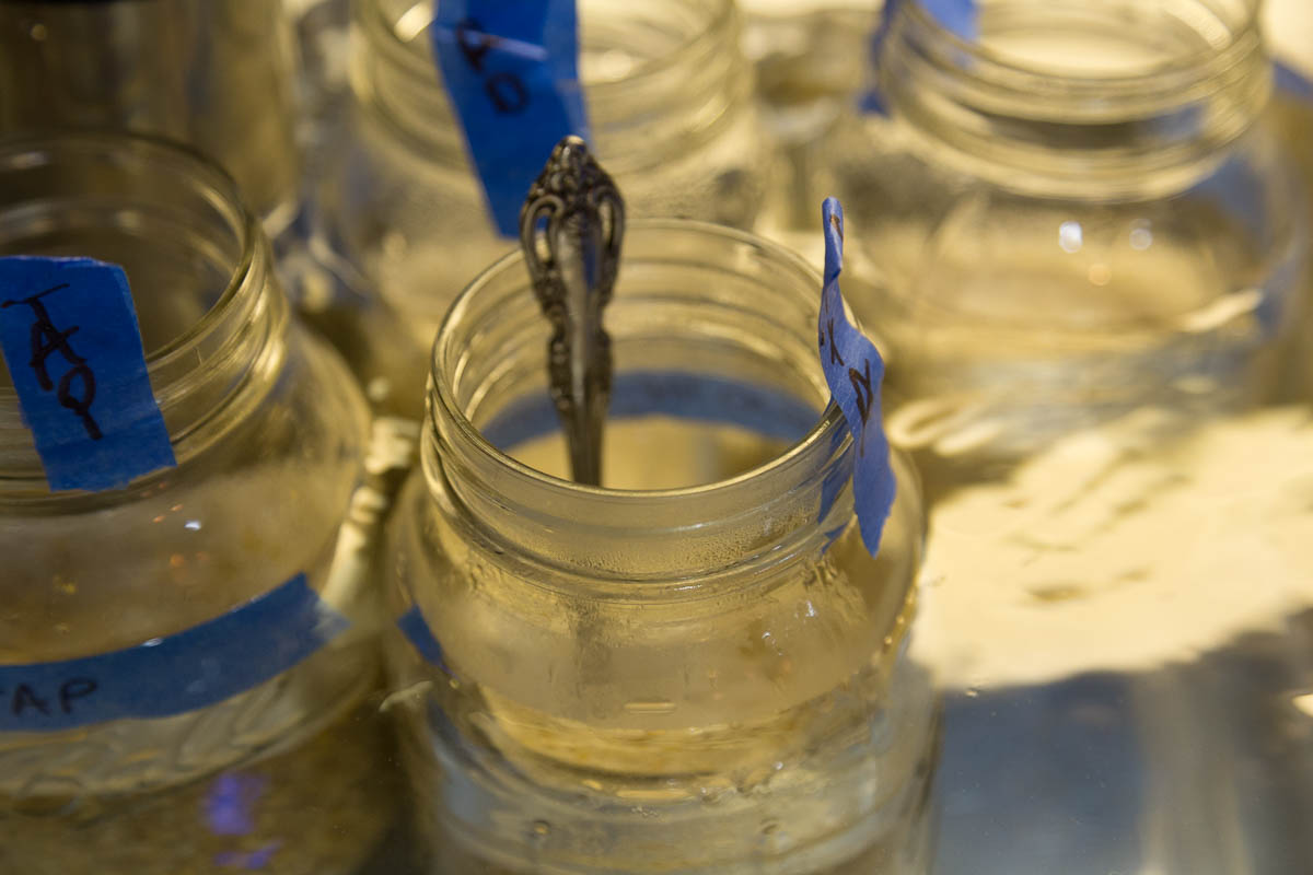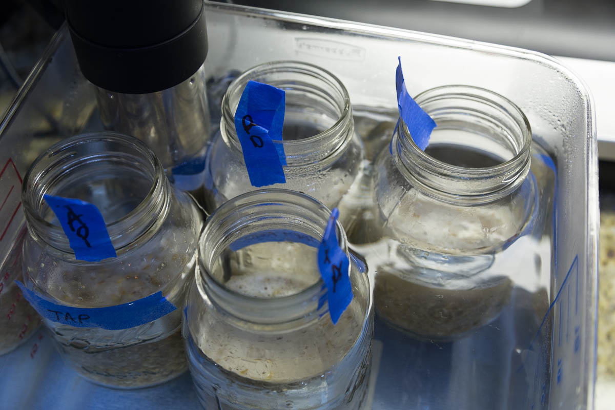 To take this experiment a step further and evaluate the impact of alkalinity on a beer mash, I mashed 4 samples using a sous-vide water bath. The procedure used 4 ounces (113 g) of base malt (4.6L) with 400 ml of liquor (roughly 1.7 qt/pound water:grist). I used my standard coarse crush for my RIMS system. The four samples are tagged as: RO, RO+Acid, Tap, Tap+Acid. The acid additions were calculated in Bru'n Water Spreadsheet to achieve an estimated mash pH of 5.4. However, I made a huge error by adding roughly double the required acid to the Tap+Acid sample. Where the photos show labels that say (5.4)Tap+Acid, the actual pH was MUCH lower. The process is documented in the photos below. The samples were mashed at 158F/70C for 60 minutes, stirred completely every 15 minutes. The samples were then decanted and filtered through paper towels. They were not boiled, but we can compare color, clarity, wort yield, and extract. We expected the proper mash pH (acidified) samples to have the highest quality yield (volume and extract).