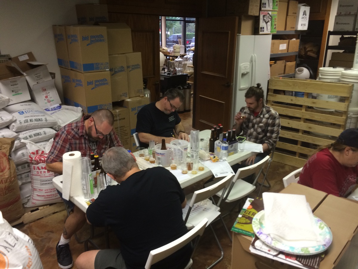 Sunday morning, I was expecting only 4 judges. But I twisted Chris Colby's (Beer and Wine Journal) arm into coming to judge, and we landed three sets of judges again! I set up the last three flights, got the judges moving and started organizing my paper work. Folks were a bit more chatty on Sunday, and it was fun to listen in to some of the conversations. The judges were having a good time, but still taking the time to write carefully considered score sheets. I ran out, grabbed armfuls of brisket and sausage, and returned for lunch. SoCo Homebrew was much busier on Sunday, because the rains had let up and we escaped the weekend without our usual devastating flash floods... folks were venturing out. A few peeked in to see us judging, and I got to guide them toward the BJCP site.