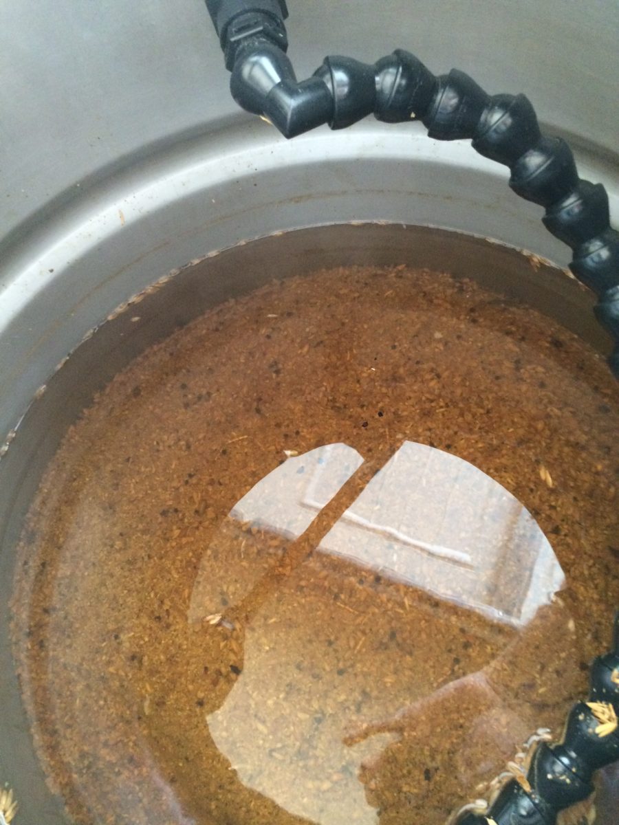 I can't hold a camera and grain in... so assume it all went very well. I prepare my strike water in the tun and heat to about 164F to hit 154F. Minerals split between the strike and sparge water. I run the RIMS with direct heat to bring the water to temperature - which also helps even the heat distribution in the system. After mash in, I slowly bring the recirculation speed up. With a more fine mill, the circulation is slow. With this grind, I was able to recirculate very quickly... nearly double the rate of the fine grist.