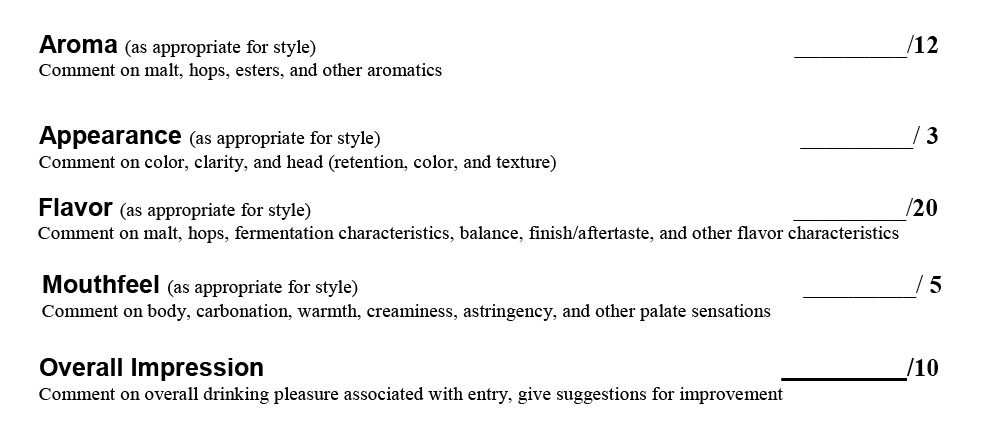 Perception (20): Each scoresheet is judged against a rubric created from the proctor scoresheet, and points are deducted for missed flaws, errors in aroma, appearance, flavor, and mouthfeel perception. However, if the participants' consensus finds something that the proctors missed, then no penalty should be given. Please make a point when writing your exam sheet to comment on each sub-topic under the category area and include both INTENSITY and QUALITY of that topic. For example: "Very High Maltiness featuring both high roasty and medium caramel notes. Medium white bread malt in the middle."